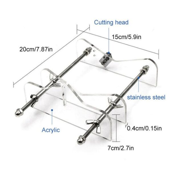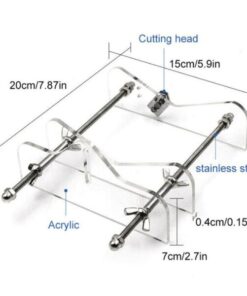 1. تحديد موضع الزجاجة- يتم وضع الزجاجة بالطول على القاطع مع محاذاة الجزء السفلي من المسند الخلفي ووضعها على البكرات. يحدد موضع المسند الخلفي والبكرات الخلفية النقطة التي تقطع عندها الزجاجة. لضبط الطول، قم بفك المسمار وحرك المسند الخلفي والبكرات للأمام للحصول على قطع أقصر وللخلف للحصول على قطع أطول.