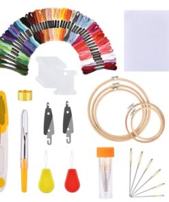 تتضمن الحزمة: 50x خيوط تطريز، 5x حلقات تطريز، 2x قماش غرز متقاطعة، 9x إبر، 1x صندوق إبرة، 1x مقص، 2x إدراج إبرة، 1x كشتبان،
